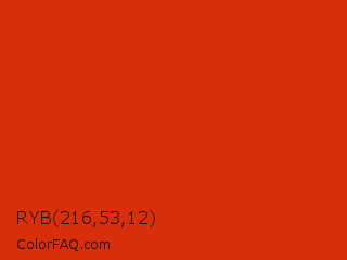 RYB 216,53,12 Color is a normal red color and the nearest color is Vermilion #d9381e. Hex code #d82e0c and RGB value is rgb(216,46,12). In RGB color space, this color is composed of 85% red, 18% green, 5% blue, In CMYK color space, this color is composed of 0% cyan, 79% magenta, 94% yellow , 15% black , In HSL color space, this color has a hue angle of 10° , 89% saturation and 45% lightness.