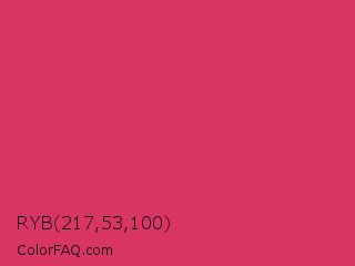 RYB 217,53,100 Color is a normal rose color and the nearest color is Cerise Red #de3163. Hex code #d93564 and RGB value is rgb(217,53,100). In RGB color space, this color is composed of 85% red, 21% green, 39% blue, In CMYK color space, this color is composed of 0% cyan, 76% magenta, 54% yellow , 15% black , In HSL color space, this color has a hue angle of 343° , 68% saturation and 53% lightness.