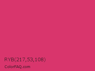 RYB 217,53,108 Color is a normal rose color and the nearest color is Cerise Red #de3163. Hex code #d9356c and RGB value is rgb(217,53,108). In RGB color space, this color is composed of 85% red, 21% green, 42% blue, In CMYK color space, this color is composed of 0% cyan, 76% magenta, 50% yellow , 15% black , In HSL color space, this color has a hue angle of 340° , 68% saturation and 53% lightness.