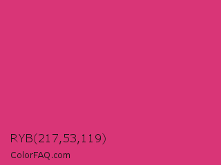 RYB 217,53,119 Color is a normal rose color and the nearest color is Telemagenta #cf3476. Hex code #d93577 and RGB value is rgb(217,53,119). In RGB color space, this color is composed of 85% red, 21% green, 47% blue, In CMYK color space, this color is composed of 0% cyan, 76% magenta, 45% yellow , 15% black , In HSL color space, this color has a hue angle of 336° , 68% saturation and 53% lightness.