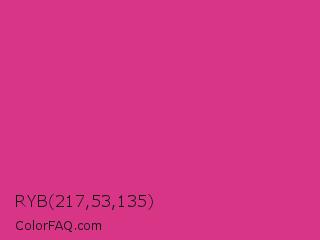 RYB 217,53,135 Color is a normal rose color and the nearest color is Cerise #da3287. Hex code #d93587 and RGB value is rgb(217,53,135). In RGB color space, this color is composed of 85% red, 21% green, 53% blue, In CMYK color space, this color is composed of 0% cyan, 76% magenta, 38% yellow , 15% black , In HSL color space, this color has a hue angle of 330° , 68% saturation and 53% lightness.