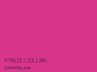 RYB 217,53,138 Color is a normal rose color and the nearest color is Cerise #da3287. Hex code #d9358a and RGB value is rgb(217,53,138). In RGB color space, this color is composed of 85% red, 21% green, 54% blue, In CMYK color space, this color is composed of 0% cyan, 76% magenta, 36% yellow , 15% black , In HSL color space, this color has a hue angle of 329° , 68% saturation and 53% lightness.