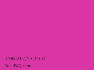 RYB 217,53,165 Color is a normal magenta color and the nearest color is Frostbite #e936a7. Hex code #d935a5 and RGB value is rgb(217,53,165). In RGB color space, this color is composed of 85% red, 21% green, 65% blue, In CMYK color space, this color is composed of 0% cyan, 76% magenta, 24% yellow , 15% black , In HSL color space, this color has a hue angle of 319° , 68% saturation and 53% lightness.