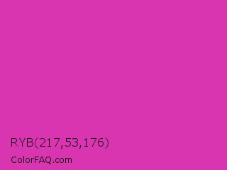 RYB 217,53,176 Color is a normal magenta color and the nearest color is Frostbite #e936a7. Hex code #d935b0 and RGB value is rgb(217,53,176). In RGB color space, this color is composed of 85% red, 21% green, 69% blue, In CMYK color space, this color is composed of 0% cyan, 76% magenta, 19% yellow , 15% black , In HSL color space, this color has a hue angle of 315° , 68% saturation and 53% lightness.