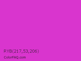 RYB 217,53,206 Color is a normal magenta color and the nearest color is Steel Pink #cc33cc. Hex code #d935ce and RGB value is rgb(217,53,206). In RGB color space, this color is composed of 85% red, 21% green, 81% blue, In CMYK color space, this color is composed of 0% cyan, 76% magenta, 5% yellow , 15% black , In HSL color space, this color has a hue angle of 304° , 68% saturation and 53% lightness.