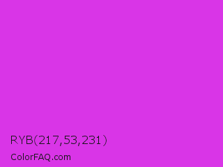 RYB 217,53,231 Color is a normal magenta color and the nearest color is Steel Pink #cc33cc. Hex code #d935e7 and RGB value is rgb(217,53,231). In RGB color space, this color is composed of 85% red, 21% green, 91% blue, In CMYK color space, this color is composed of 6% cyan, 77% magenta, 0% yellow , 9% black , In HSL color space, this color has a hue angle of 295° , 79% saturation and 56% lightness.