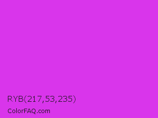 RYB 217,53,235 Color is a normal magenta color and the nearest color is Steel Pink #cc33cc. Hex code #d935eb and RGB value is rgb(217,53,235). In RGB color space, this color is composed of 85% red, 21% green, 92% blue, In CMYK color space, this color is composed of 8% cyan, 77% magenta, 0% yellow , 8% black , In HSL color space, this color has a hue angle of 294° , 82% saturation and 56% lightness.