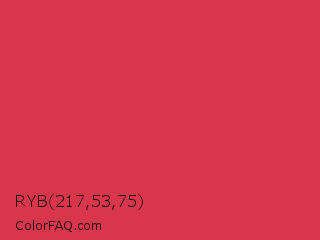 RYB 217,53,75 Color is a normal red color and the nearest color is Rusty Red #da2c43. Hex code #d9354b and RGB value is rgb(217,53,75). In RGB color space, this color is composed of 85% red, 21% green, 29% blue, In CMYK color space, this color is composed of 0% cyan, 76% magenta, 65% yellow , 15% black , In HSL color space, this color has a hue angle of 352° , 68% saturation and 53% lightness.