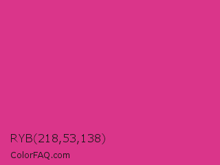 RYB 218,53,138 Color is a normal rose color and the nearest color is Cerise #da3287. Hex code #da358a and RGB value is rgb(218,53,138). In RGB color space, this color is composed of 85% red, 21% green, 54% blue, In CMYK color space, this color is composed of 0% cyan, 76% magenta, 37% yellow , 15% black , In HSL color space, this color has a hue angle of 329° , 69% saturation and 53% lightness.