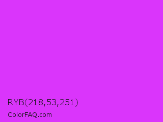 RYB 218,53,251 Color is a normal purple color and the nearest color is Steel Pink #cc33cc. Hex code #da35fb and RGB value is rgb(218,53,251). In RGB color space, this color is composed of 85% red, 21% green, 98% blue, In CMYK color space, this color is composed of 13% cyan, 79% magenta, 0% yellow , 2% black , In HSL color space, this color has a hue angle of 290° , 96% saturation and 60% lightness.