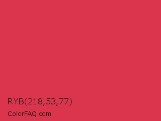 RYB 218,53,77 Color is a normal red color and the nearest color is Rusty Red #da2c43. Hex code #da354d and RGB value is rgb(218,53,77). In RGB color space, this color is composed of 85% red, 21% green, 30% blue, In CMYK color space, this color is composed of 0% cyan, 76% magenta, 65% yellow , 15% black , In HSL color space, this color has a hue angle of 351° , 69% saturation and 53% lightness.