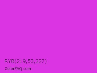 RYB 219,53,227 Color is a normal magenta color and the nearest color is Steel Pink #cc33cc. Hex code #db35e3 and RGB value is rgb(219,53,227). In RGB color space, this color is composed of 86% red, 21% green, 89% blue, In CMYK color space, this color is composed of 4% cyan, 77% magenta, 0% yellow , 11% black , In HSL color space, this color has a hue angle of 297° , 76% saturation and 55% lightness.