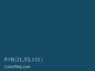 RYB 21,53,101 Color is a dark blue color and the nearest color is Deep Sea Green #095859. Hex code #154a65 and RGB value is rgb(21,74,101). In RGB color space, this color is composed of 8% red, 29% green, 40% blue, In CMYK color space, this color is composed of 79% cyan, 27% magenta, 0% yellow , 60% black , In HSL color space, this color has a hue angle of 200° , 66% saturation and 24% lightness.