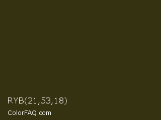 RYB 21,53,18 Color is a very dark yellow color and the nearest color is Woodrush #302a0f. Hex code #353212 and RGB value is rgb(53,50,18). In RGB color space, this color is composed of 21% red, 20% green, 7% blue, In CMYK color space, this color is composed of 0% cyan, 6% magenta, 66% yellow , 79% black , In HSL color space, this color has a hue angle of 55° , 49% saturation and 14% lightness.