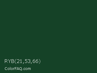 RYB 21,53,66 Color is a very dark green color and the nearest color is Everglade #1c402e. Hex code #154227 and RGB value is rgb(21,66,39). In RGB color space, this color is composed of 8% red, 26% green, 15% blue, In CMYK color space, this color is composed of 68% cyan, 0% magenta, 41% yellow , 74% black , In HSL color space, this color has a hue angle of 144° , 52% saturation and 17% lightness.