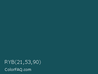 RYB 21,53,90 Color is a very dark cyan color and the nearest color is Eden #105852. Hex code #15515a and RGB value is rgb(21,81,90). In RGB color space, this color is composed of 8% red, 32% green, 35% blue, In CMYK color space, this color is composed of 77% cyan, 10% magenta, 0% yellow , 65% black , In HSL color space, this color has a hue angle of 188° , 62% saturation and 22% lightness.