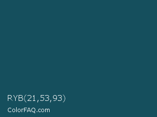 RYB 21,53,93 Color is a very dark cyan color and the nearest color is Eden #105852. Hex code #154f5d and RGB value is rgb(21,79,93). In RGB color space, this color is composed of 8% red, 31% green, 36% blue, In CMYK color space, this color is composed of 77% cyan, 15% magenta, 0% yellow , 64% black , In HSL color space, this color has a hue angle of 192° , 63% saturation and 22% lightness.