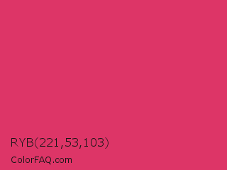 RYB 221,53,103 Color is a normal rose color and the nearest color is Cerise Red #de3163. Hex code #dd3567 and RGB value is rgb(221,53,103). In RGB color space, this color is composed of 87% red, 21% green, 40% blue, In CMYK color space, this color is composed of 0% cyan, 76% magenta, 53% yellow , 13% black , In HSL color space, this color has a hue angle of 342° , 71% saturation and 54% lightness.