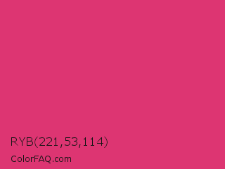 RYB 221,53,114 Color is a normal rose color and the nearest color is Telemagenta #cf3476. Hex code #dd3572 and RGB value is rgb(221,53,114). In RGB color space, this color is composed of 87% red, 21% green, 45% blue, In CMYK color space, this color is composed of 0% cyan, 76% magenta, 48% yellow , 13% black , In HSL color space, this color has a hue angle of 338° , 71% saturation and 54% lightness.