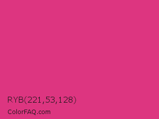 RYB 221,53,128 Color is a normal rose color and the nearest color is Cerise #da3287. Hex code #dd3580 and RGB value is rgb(221,53,128). In RGB color space, this color is composed of 87% red, 21% green, 50% blue, In CMYK color space, this color is composed of 0% cyan, 76% magenta, 42% yellow , 13% black , In HSL color space, this color has a hue angle of 333° , 71% saturation and 54% lightness.