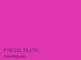 RYB 221,53,176 Color is a normal magenta color and the nearest color is Frostbite #e936a7. Hex code #dd35b0 and RGB value is rgb(221,53,176). In RGB color space, this color is composed of 87% red, 21% green, 69% blue, In CMYK color space, this color is composed of 0% cyan, 76% magenta, 20% yellow , 13% black , In HSL color space, this color has a hue angle of 316° , 71% saturation and 54% lightness.