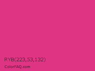 RYB 223,53,132 Color is a normal rose color and the nearest color is Cerise #da3287. Hex code #df3584 and RGB value is rgb(223,53,132). In RGB color space, this color is composed of 87% red, 21% green, 52% blue, In CMYK color space, this color is composed of 0% cyan, 76% magenta, 41% yellow , 13% black , In HSL color space, this color has a hue angle of 332° , 73% saturation and 54% lightness.