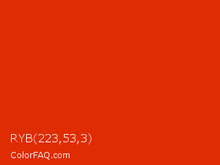 RYB 223,53,3 Color is a normal red color and the nearest color is Grenadier #d54600. Hex code #df2c03 and RGB value is rgb(223,44,3). In RGB color space, this color is composed of 87% red, 17% green, 1% blue, In CMYK color space, this color is composed of 0% cyan, 80% magenta, 99% yellow , 13% black , In HSL color space, this color has a hue angle of 11° , 97% saturation and 44% lightness.