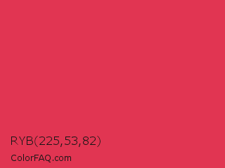 RYB 225,53,82 Color is a normal red color and the nearest color is Amaranth #e52b50. Hex code #e13552 and RGB value is rgb(225,53,82). In RGB color space, this color is composed of 88% red, 21% green, 32% blue, In CMYK color space, this color is composed of 0% cyan, 76% magenta, 64% yellow , 12% black , In HSL color space, this color has a hue angle of 350° , 74% saturation and 55% lightness.