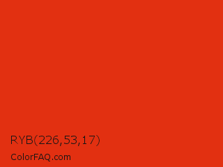 RYB 226,53,17 Color is a normal red color and the nearest color is Vermilion #d9381e. Hex code #e23011 and RGB value is rgb(226,48,17). In RGB color space, this color is composed of 89% red, 19% green, 7% blue, In CMYK color space, this color is composed of 0% cyan, 79% magenta, 92% yellow , 11% black , In HSL color space, this color has a hue angle of 9° , 86% saturation and 48% lightness.
