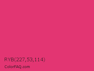 RYB 227,53,114 Color is a normal rose color and the nearest color is Cerise Red #de3163. Hex code #e33572 and RGB value is rgb(227,53,114). In RGB color space, this color is composed of 89% red, 21% green, 45% blue, In CMYK color space, this color is composed of 0% cyan, 77% magenta, 50% yellow , 11% black , In HSL color space, this color has a hue angle of 339° , 76% saturation and 55% lightness.