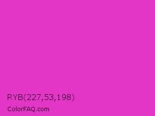 RYB 227,53,198 Color is a normal magenta color and the nearest color is Steel Pink #cc33cc. Hex code #e335c6 and RGB value is rgb(227,53,198). In RGB color space, this color is composed of 89% red, 21% green, 78% blue, In CMYK color space, this color is composed of 0% cyan, 77% magenta, 13% yellow , 11% black , In HSL color space, this color has a hue angle of 310° , 76% saturation and 55% lightness.