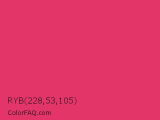 RYB 228,53,105 Color is a normal rose color and the nearest color is Cerise Red #de3163. Hex code #e43569 and RGB value is rgb(228,53,105). In RGB color space, this color is composed of 89% red, 21% green, 41% blue, In CMYK color space, this color is composed of 0% cyan, 77% magenta, 54% yellow , 11% black , In HSL color space, this color has a hue angle of 342° , 76% saturation and 55% lightness.