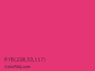 RYB 228,53,117 Color is a normal rose color and the nearest color is Cerise Pink #ec3b83. Hex code #e43575 and RGB value is rgb(228,53,117). In RGB color space, this color is composed of 89% red, 21% green, 46% blue, In CMYK color space, this color is composed of 0% cyan, 77% magenta, 49% yellow , 11% black , In HSL color space, this color has a hue angle of 338° , 76% saturation and 55% lightness.
