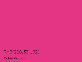 RYB 228,53,132 Color is a normal rose color and the nearest color is Cerise Pink #ec3b83. Hex code #e43584 and RGB value is rgb(228,53,132). In RGB color space, this color is composed of 89% red, 21% green, 52% blue, In CMYK color space, this color is composed of 0% cyan, 77% magenta, 42% yellow , 11% black , In HSL color space, this color has a hue angle of 333° , 76% saturation and 55% lightness.
