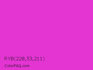 RYB 228,53,211 Color is a normal magenta color and the nearest color is Steel Pink #cc33cc. Hex code #e435d3 and RGB value is rgb(228,53,211). In RGB color space, this color is composed of 89% red, 21% green, 83% blue, In CMYK color space, this color is composed of 0% cyan, 77% magenta, 7% yellow , 11% black , In HSL color space, this color has a hue angle of 306° , 76% saturation and 55% lightness.