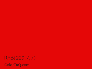 RYB 229,7,7 Color is a normal red color and the nearest color is KU Crimson #e8000d. Hex code #e50707 and RGB value is rgb(229,7,7). In RGB color space, this color is composed of 90% red, 3% green, 3% blue, In CMYK color space, this color is composed of 0% cyan, 97% magenta, 97% yellow , 10% black , In HSL color space, this color has a hue angle of 0° , 94% saturation and 46% lightness.