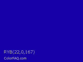 RYB 22,0,167 Color is a normal indigo color and the nearest color is Duke Blue #00009c. Hex code #1600a7 and RGB value is rgb(22,0,167). In RGB color space, this color is composed of 9% red, 0% green, 65% blue, In CMYK color space, this color is composed of 87% cyan, 100% magenta, 0% yellow , 35% black , In HSL color space, this color has a hue angle of 248° , 100% saturation and 33% lightness.