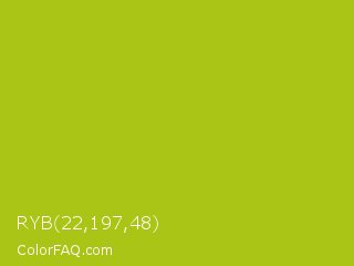 RYB 22,197,48 Color is a normal yellow color and the nearest color is Acid Green #b0bf1a. Hex code #abc516 and RGB value is rgb(171,197,22). In RGB color space, this color is composed of 67% red, 77% green, 9% blue, In CMYK color space, this color is composed of 13% cyan, 0% magenta, 89% yellow , 23% black , In HSL color space, this color has a hue angle of 69° , 80% saturation and 43% lightness.