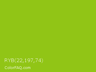 RYB 22,197,74 Color is a normal lime color and the nearest color is Pistachio Green #9dc209. Hex code #91c516 and RGB value is rgb(145,197,22). In RGB color space, this color is composed of 57% red, 77% green, 9% blue, In CMYK color space, this color is composed of 26% cyan, 0% magenta, 89% yellow , 23% black , In HSL color space, this color has a hue angle of 78° , 80% saturation and 43% lightness.