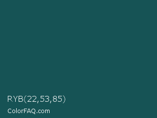 RYB 22,53,85 Color is a very dark cyan color and the nearest color is Eden #105852. Hex code #165355 and RGB value is rgb(22,83,85). In RGB color space, this color is composed of 9% red, 33% green, 33% blue, In CMYK color space, this color is composed of 74% cyan, 2% magenta, 0% yellow , 67% black , In HSL color space, this color has a hue angle of 182° , 59% saturation and 21% lightness.