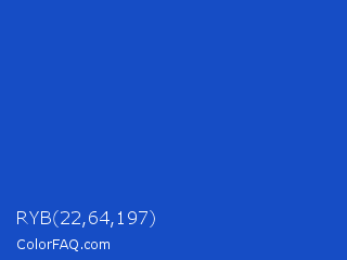 RYB 22,64,197 Color is a normal blue color and the nearest color is New Car #214fc6. Hex code #164dc5 and RGB value is rgb(22,77,197). In RGB color space, this color is composed of 9% red, 30% green, 77% blue, In CMYK color space, this color is composed of 89% cyan, 61% magenta, 0% yellow , 23% black , In HSL color space, this color has a hue angle of 221° , 80% saturation and 43% lightness.