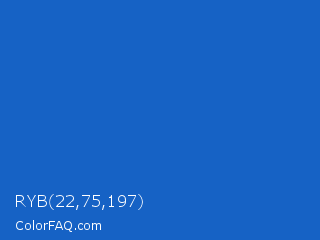 RYB 22,75,197 Color is a normal blue color and the nearest color is Denim #1560bd. Hex code #1662c5 and RGB value is rgb(22,98,197). In RGB color space, this color is composed of 9% red, 38% green, 77% blue, In CMYK color space, this color is composed of 89% cyan, 50% magenta, 0% yellow , 23% black , In HSL color space, this color has a hue angle of 214° , 80% saturation and 43% lightness.