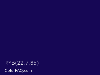 RYB 22,7,85 Color is a very dark indigo color and the nearest color is Tolopea #1b0245. Hex code #160755 and RGB value is rgb(22,7,85). In RGB color space, this color is composed of 9% red, 3% green, 33% blue, In CMYK color space, this color is composed of 74% cyan, 92% magenta, 0% yellow , 67% black , In HSL color space, this color has a hue angle of 252° , 85% saturation and 18% lightness.