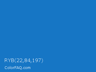 RYB 22,84,197 Color is a normal blue color and the nearest color is Bright Navy Blue #1974d2. Hex code #1676c5 and RGB value is rgb(22,118,197). In RGB color space, this color is composed of 9% red, 46% green, 77% blue, In CMYK color space, this color is composed of 89% cyan, 40% magenta, 0% yellow , 23% black , In HSL color space, this color has a hue angle of 207° , 80% saturation and 43% lightness.