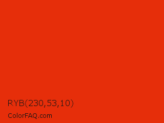 RYB 230,53,10 Color is a normal red color and the nearest color is Vermilion #d9381e. Hex code #e62e0a and RGB value is rgb(230,46,10). In RGB color space, this color is composed of 90% red, 18% green, 4% blue, In CMYK color space, this color is composed of 0% cyan, 80% magenta, 96% yellow , 10% black , In HSL color space, this color has a hue angle of 10° , 92% saturation and 47% lightness.