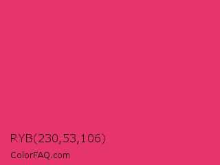 RYB 230,53,106 Color is a normal rose color and the nearest color is Cerise Red #de3163. Hex code #e6356a and RGB value is rgb(230,53,106). In RGB color space, this color is composed of 90% red, 21% green, 42% blue, In CMYK color space, this color is composed of 0% cyan, 77% magenta, 54% yellow , 10% black , In HSL color space, this color has a hue angle of 342° , 78% saturation and 55% lightness.