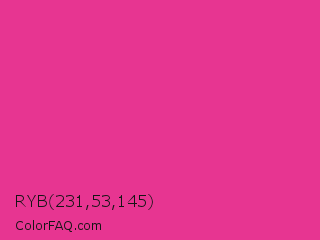 RYB 231,53,145 Color is a normal rose color and the nearest color is Cerise Pink #ec3b83. Hex code #e73591 and RGB value is rgb(231,53,145). In RGB color space, this color is composed of 91% red, 21% green, 57% blue, In CMYK color space, this color is composed of 0% cyan, 77% magenta, 37% yellow , 9% black , In HSL color space, this color has a hue angle of 329° , 79% saturation and 56% lightness.