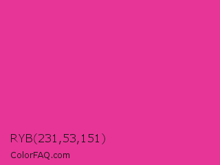 RYB 231,53,151 Color is a normal magenta color and the nearest color is Frostbite #e936a7. Hex code #e73597 and RGB value is rgb(231,53,151). In RGB color space, this color is composed of 91% red, 21% green, 59% blue, In CMYK color space, this color is composed of 0% cyan, 77% magenta, 35% yellow , 9% black , In HSL color space, this color has a hue angle of 327° , 79% saturation and 56% lightness.