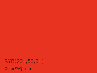 RYB 231,53,31 Color is a normal red color and the nearest color is Vermilion #d9381e. Hex code #e7331f and RGB value is rgb(231,51,31). In RGB color space, this color is composed of 91% red, 20% green, 12% blue, In CMYK color space, this color is composed of 0% cyan, 78% magenta, 87% yellow , 9% black , In HSL color space, this color has a hue angle of 6° , 81% saturation and 51% lightness.