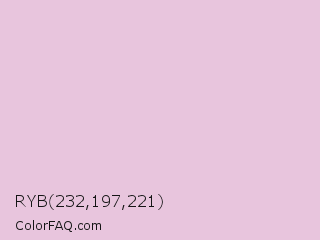 RYB 232,197,221 Color is a very light magenta color and the nearest color is Queen Pink #e8ccd7. Hex code #e8c5dd and RGB value is rgb(232,197,221). In RGB color space, this color is composed of 91% red, 77% green, 87% blue, In CMYK color space, this color is composed of 0% cyan, 15% magenta, 5% yellow , 9% black , In HSL color space, this color has a hue angle of 319° , 43% saturation and 84% lightness.